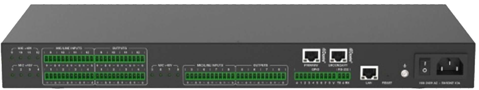 - 4x4 DANTE audio with primary and redundant network interfaces